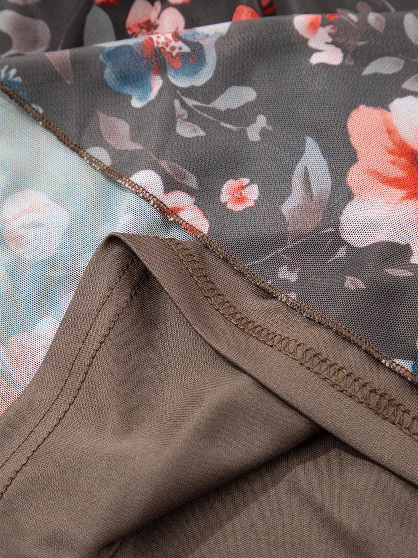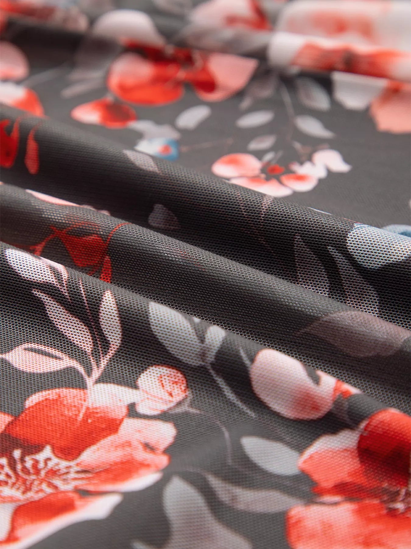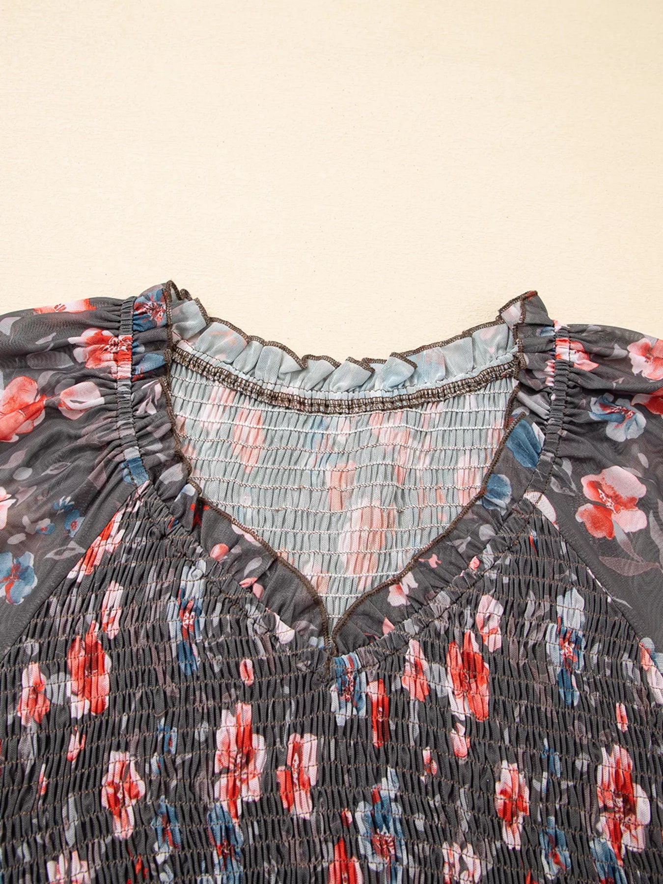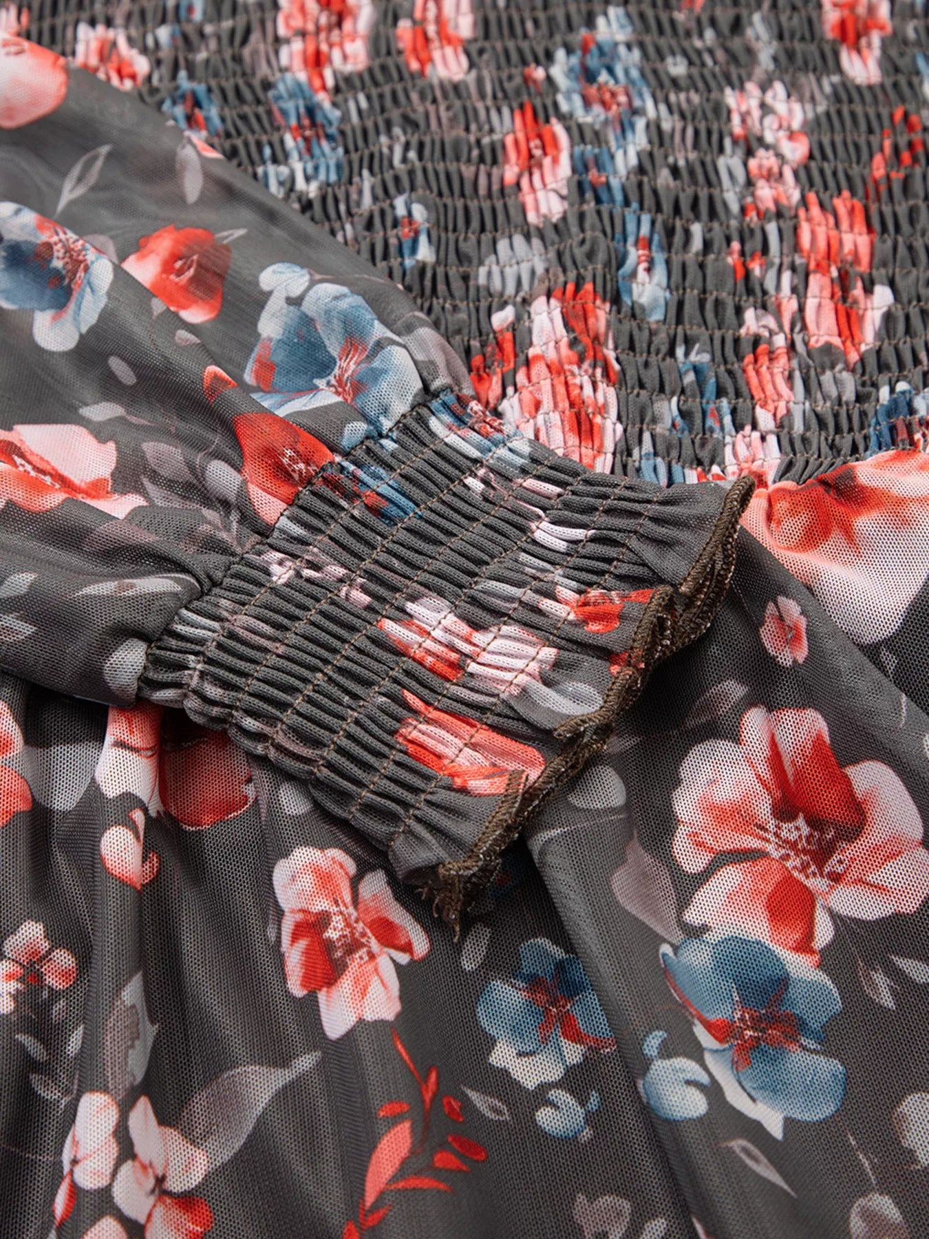 Frilly Smocked Bodice Floral Mesh Long Sleeve Mini Dress