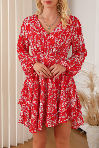 Printed Surplice Balloon Sleeve Layered Dress